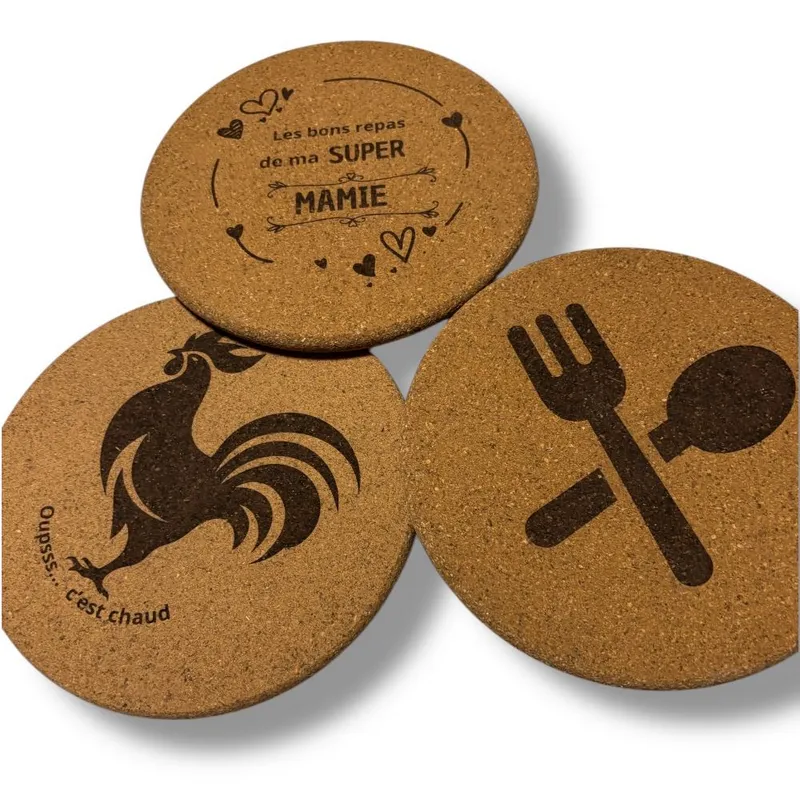 Les sous-plats en liège personnalisés sont à la fois fonctionnels et esthétiques, parfaits pour ajouter une touche personnelle à votre décoration de table tout en protégeant vos surfaces des plats chauds.